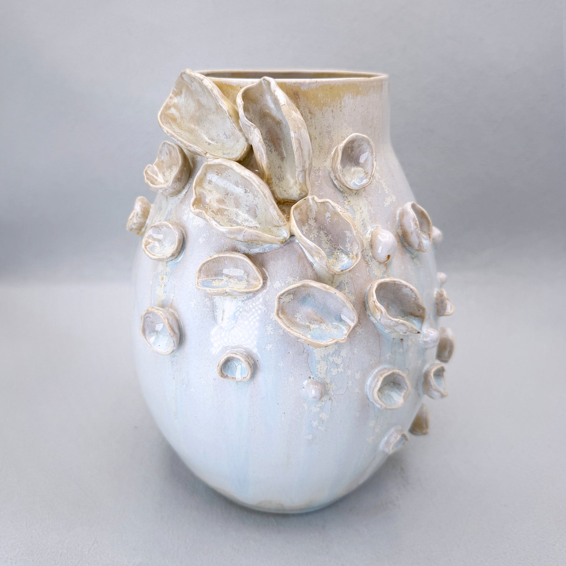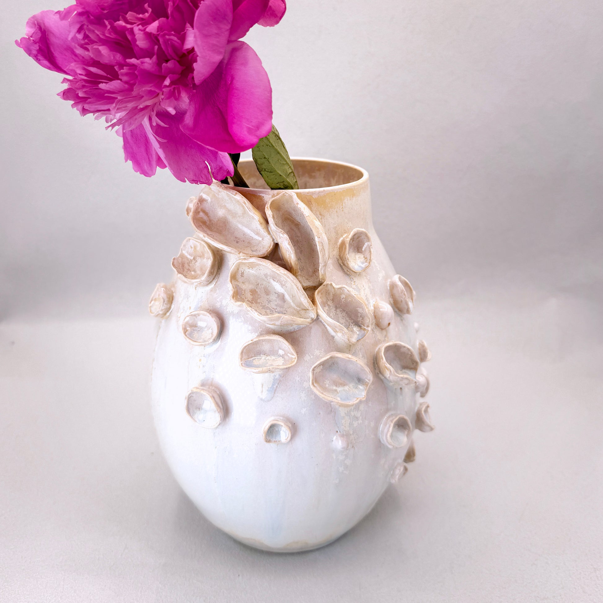 Part of the Bloomare collection, this wheel-thrown vase rises with quiet strength and delicate detail. Sculptural petals and shell-like forms are hand-built and organically placed, creating a textured bloom that feels both underwater and in full flourish.