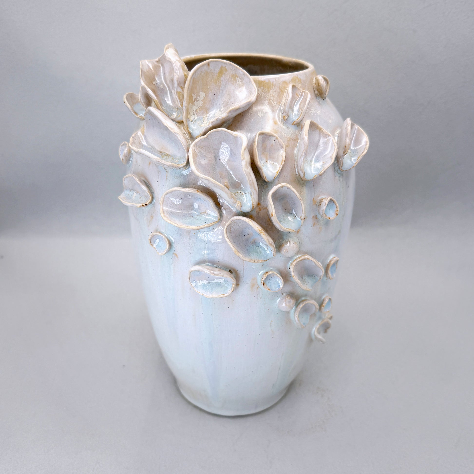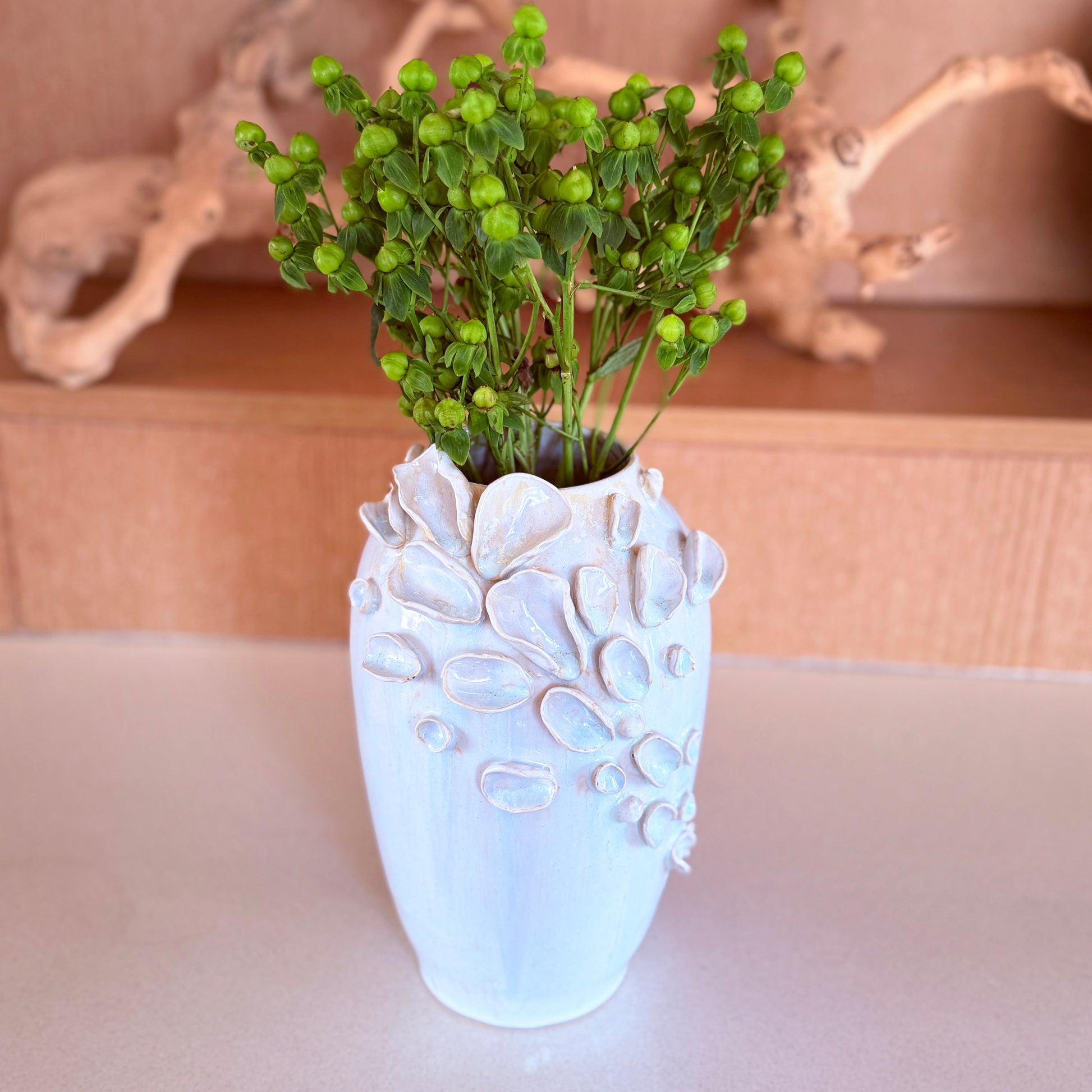 Delicate yet grounded, this tall vase from the Bloomare collection evokes soft tides and blooming shores. Hand-built petal and shell forms gently cascade across its wheel-thrown surface, creating an organic texture that feels like nature paused mid-bloom.
