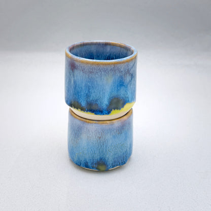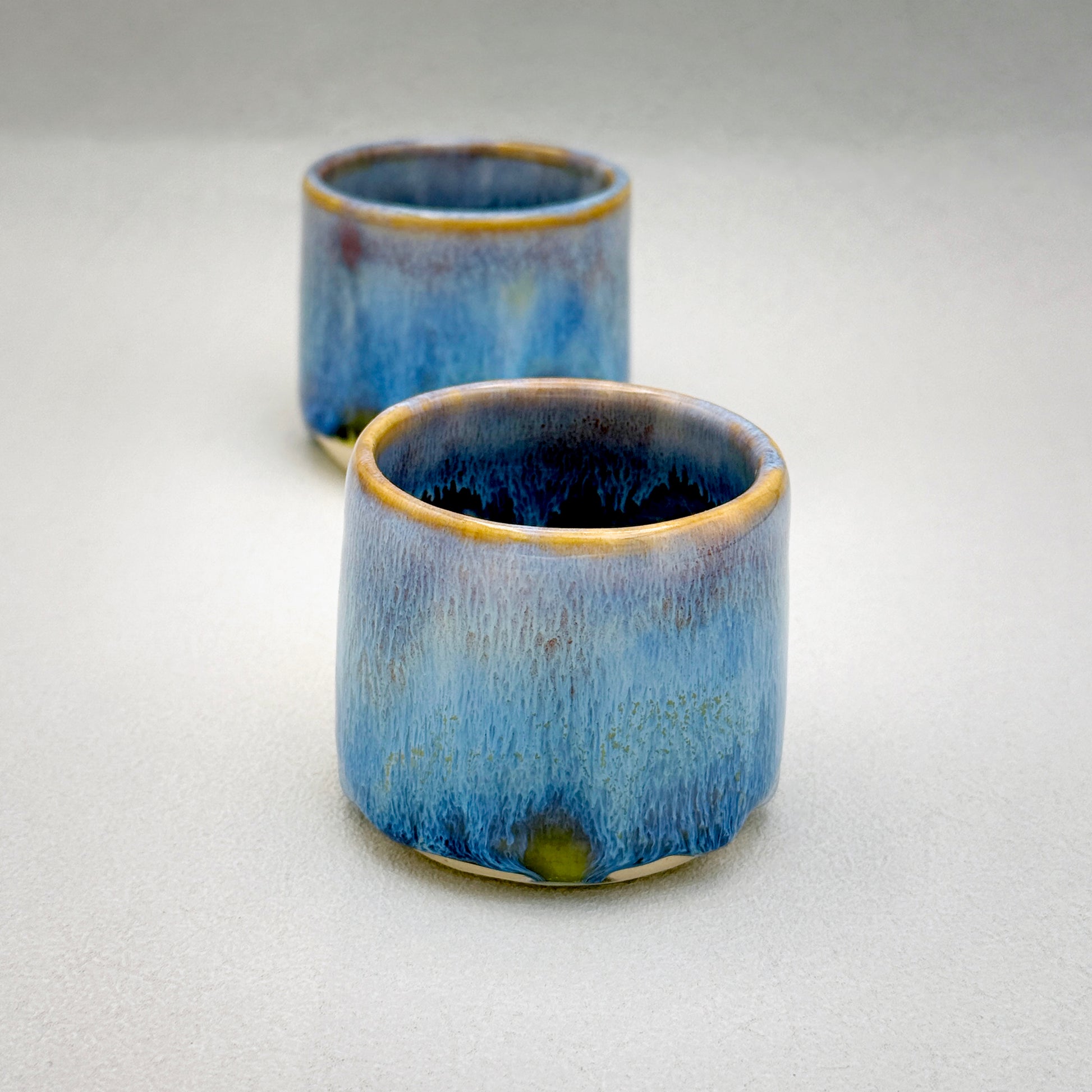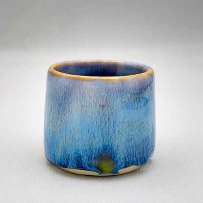 This hand-thrown tea bowl is a study in movement and quiet depth. The glaze flows like soft rainfall, fading from stormy blues into earthen moss and sandy undertones. Its intimate size and rounded form make it perfect for tea rituals, mindful sipping, or serving small delights. No two are alike — each bowl carries its own landscape within the glaze.
