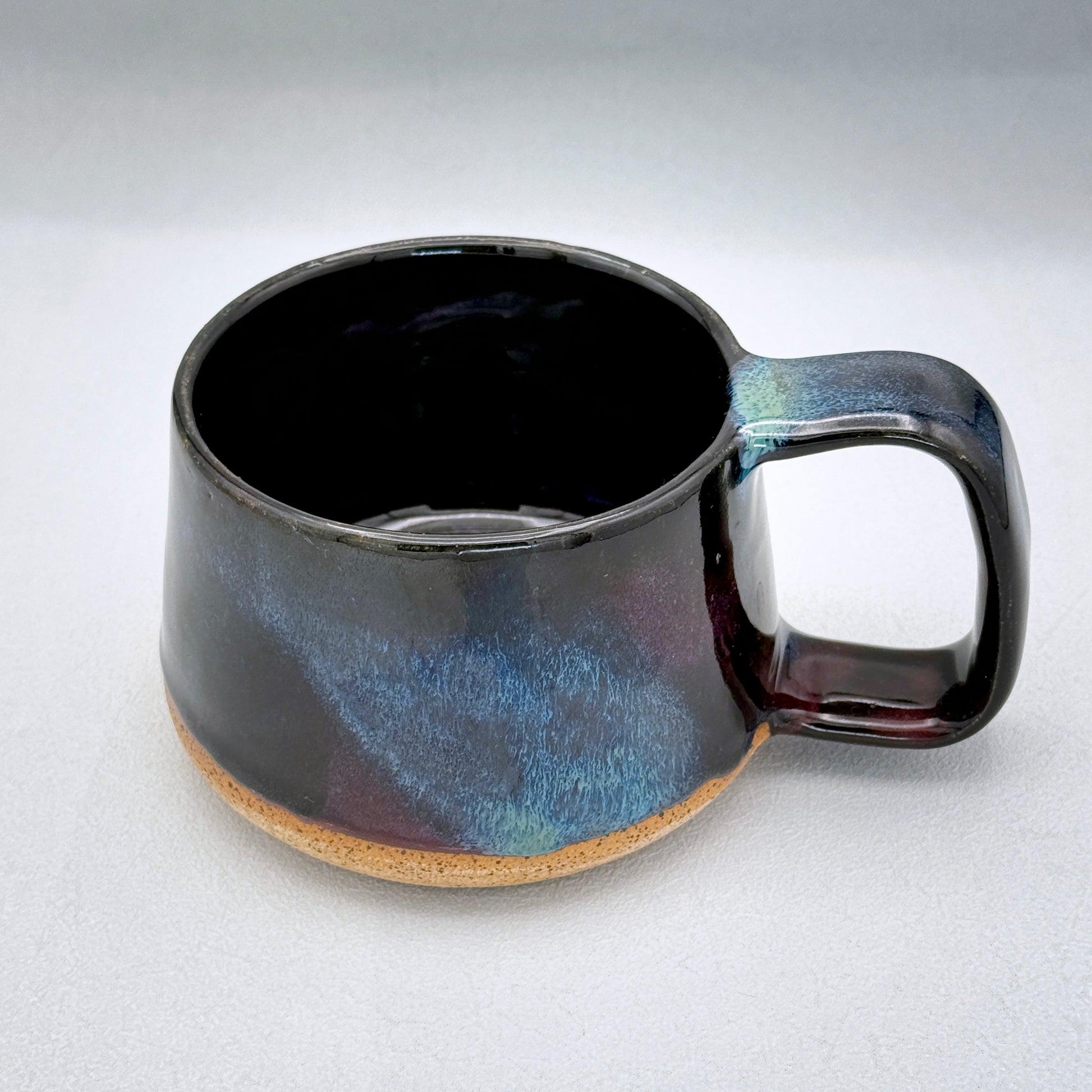 Bring a touch of the cosmos to your morning ritual. This handmade mug is crafted in warm, sandy clay and finished with a deep midnight glaze that melts into streaks of cosmic blue and hints of violet — reminiscent of the dancing Northern Lights. Each piece is one-of-a-kind, with natural variations in the glaze that make it uniquely yours.